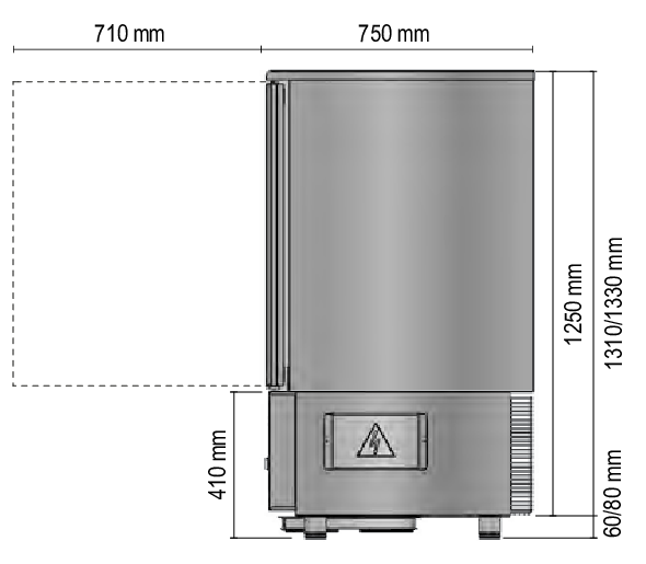 Dotazione: Sonda camera/sonda spillone, nr 15 guide per griglie GN 1/1 e teglie 600x400 mm, 4 piedoni inox regolabili h 60/80 mm